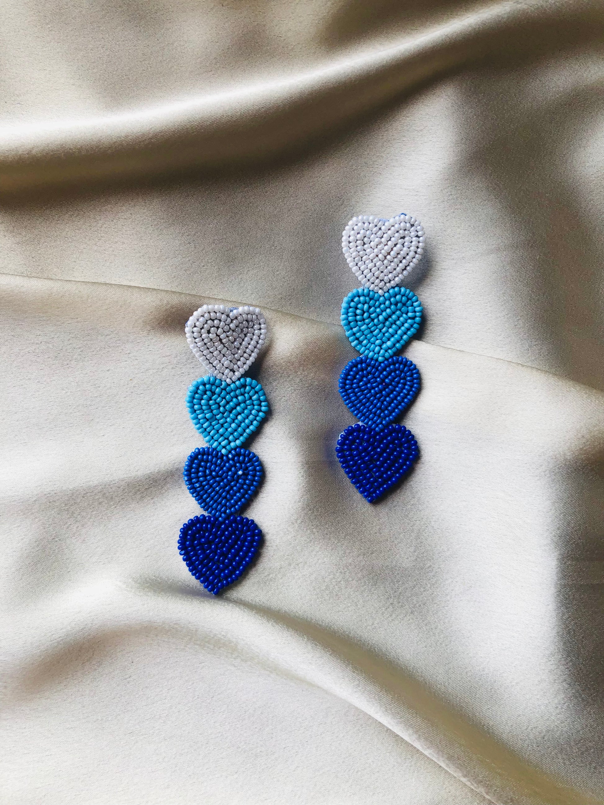 Express your heart with these delicate Hearts of Hope earrings, a soft and elegant celebration of love and connection. These earrings feature a series of gradient heart-shaped panels, hand-embroidered in soothing hues of ivory, pink, and deep fuchsia seed beads. The light-catching beadwork and the sweet heart motif make these earrings a perfect symbol of affection, making them ideal for both casual and festive occasions.