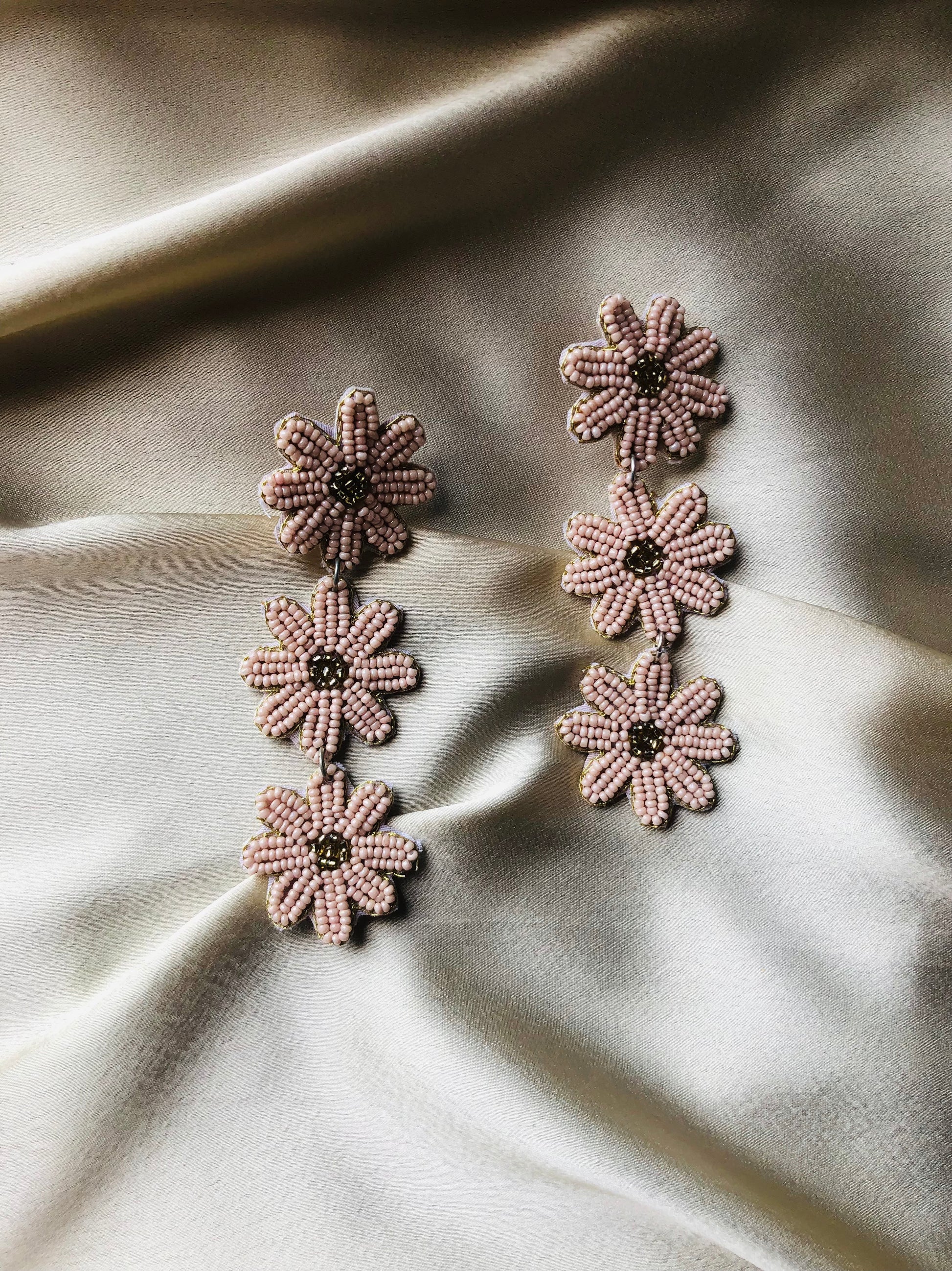 These stunning earrings feature a cascading trio of intricately handcrafted beaded flowers. Each flower, delicately woven with soft green beads and accented with a contrasting center, forms a blooming vertical garden that brings a sense of nature’s elegance to your ensemble. The triple-layer floral design offers graceful movement and an eye-catching dimension, making these earrings a beautiful ode to botanical charm.